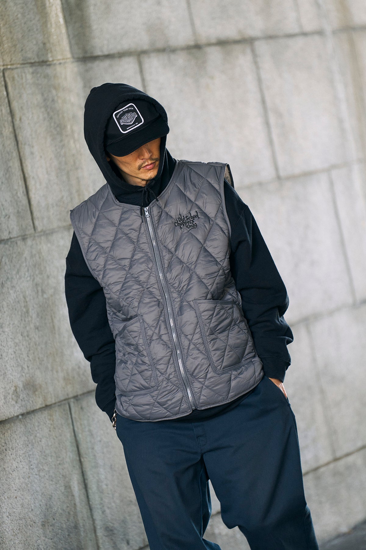 ボディは昨年大好評を頂戴し即刻完売した、ゆったりルーズな大柄キルティング素材を採用。内側には手触りの良いボアを装備する。またフロントとバックに入る丁寧な仕事の刺繍も見どころ。インナーとしてもアウターとしても様々なシチュエーションで大活躍のベスト。